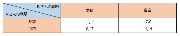Aさんが「黙秘」を選択して、Bさんが「自白」を選択した場合、Aさんには懲役7年のきびしい刑がまっています。そして、なんとBさんは捜査に協力をしたということで釈放されます(-7、0)。Aさんが「自白」を選択して、Bさんが「黙秘」を選択した場合、Aさんは釈放され、Bさんは懲役7年の刑となります(0、-7)。