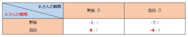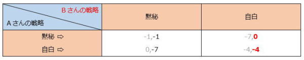 Bさんが「自白」を選択した場合のAさんの利得は、「黙秘」が「-7」、「自白」が「-4」です。この場合も、Aさんは利得が大きい「自白」を選択します。