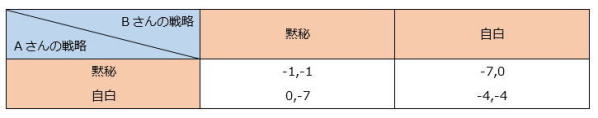 | 2人組の犯人AさんとBさんは、それぞれが取り調べを受けています。じつはこのAさんとBさん、逮捕された容疑のほかに、もっとわるい罪の容疑者でもあったのです。このもっとわるい罪の容疑について、AさんとBさんには「黙秘」をするか「自白」をするかの選択肢があります。